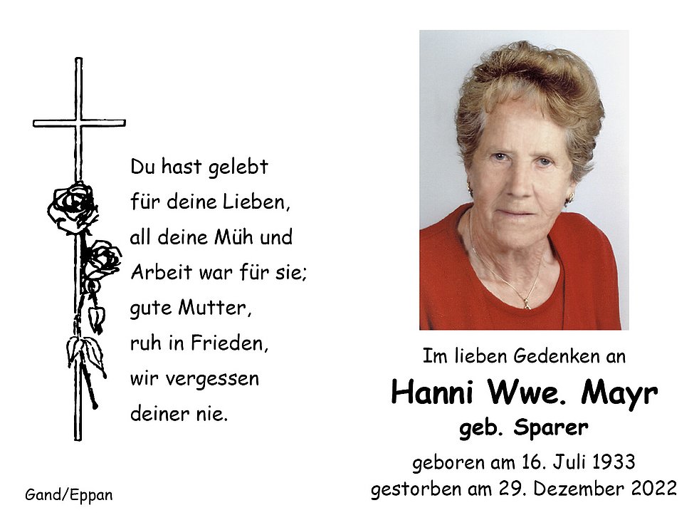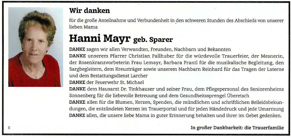 Wir danken ganz herzlichst dem Hausarzt Dr. Norbert Tinkhauser und seiner Frau für die fürsorgliche, jahrelange Zuwendung, dem Gesundheitssprengel Überetsch und dem gesamten Team des Seniorenheimes Sonnenberg für die liebevolle Betreuung und Unterstützung.