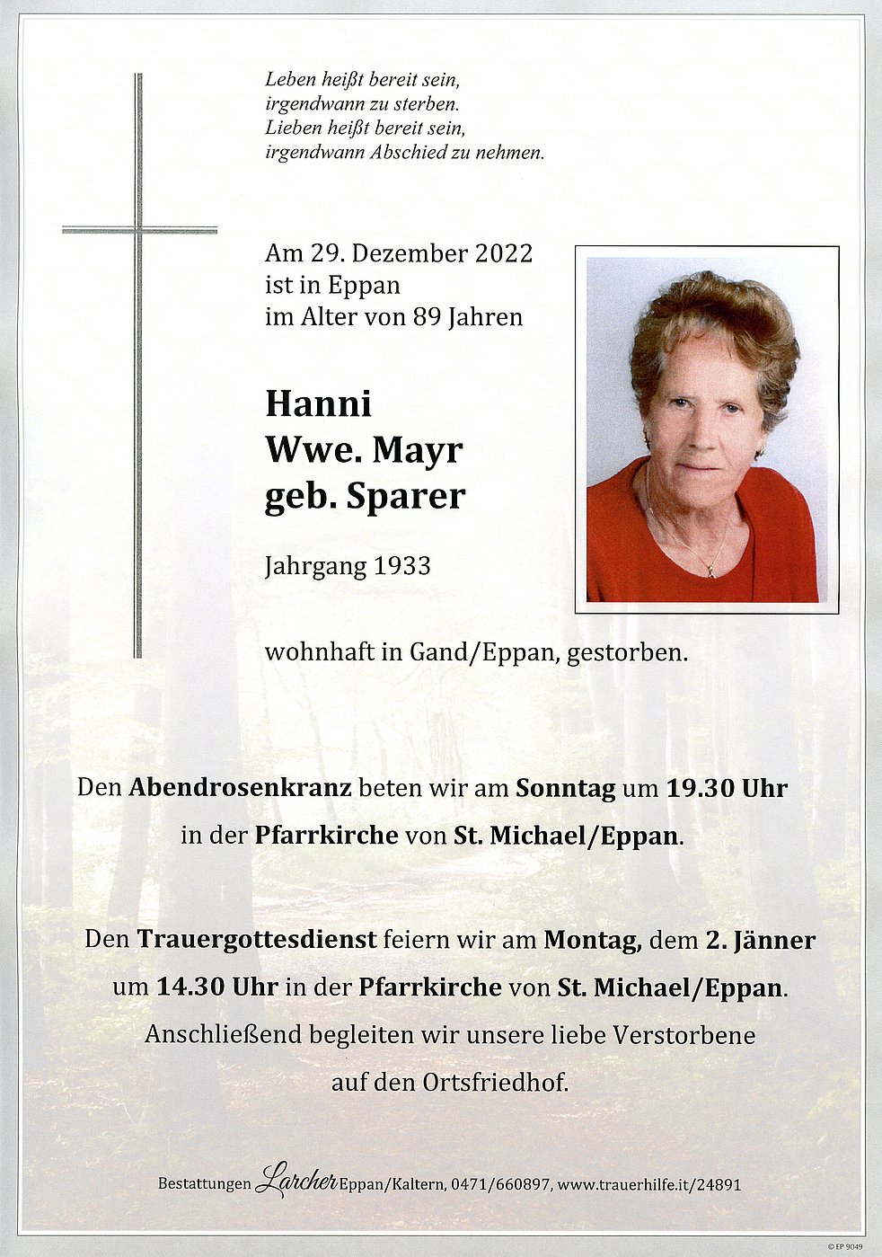 Den Trauergottesdienst feiern wir am Montag, dem 2. Jänner um 14.30 Uhr in der Pfarrkirche von St. Michael/Eppan. Anschließend begleiten wir unsere liebe Verstorbene auf den Ortsfriedhof.