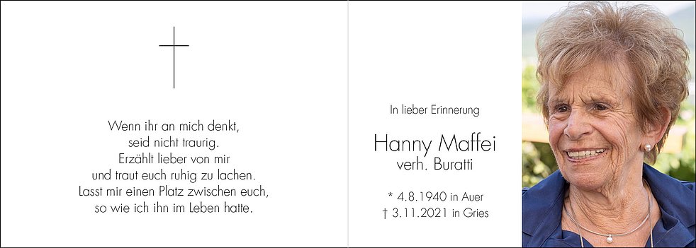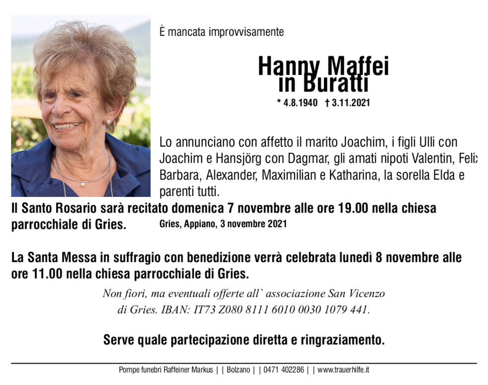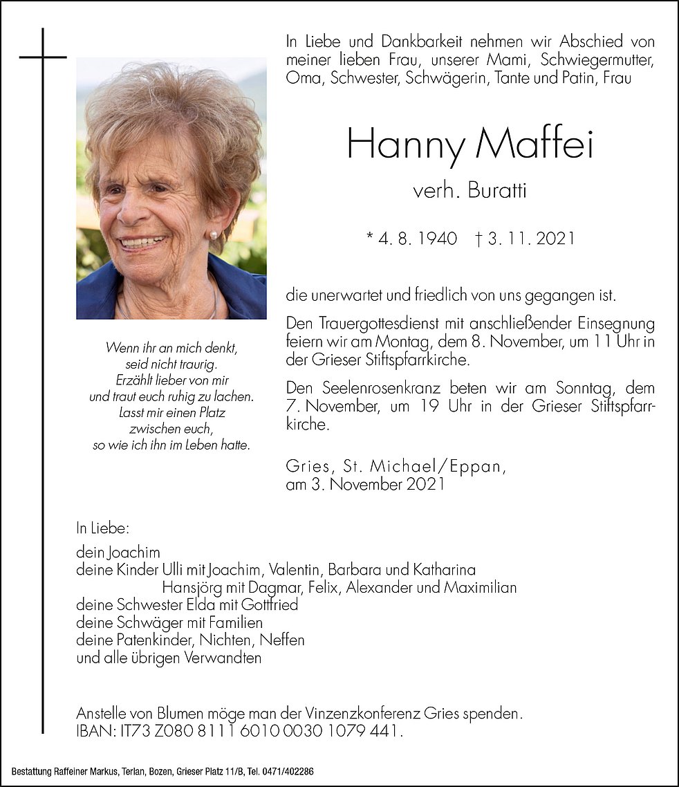 Anstelle von Blumen, möge man der Vinzenz Konferenz Gries spenden. IBAN: IT73 Z080 8111 6010 0030 1079 441.