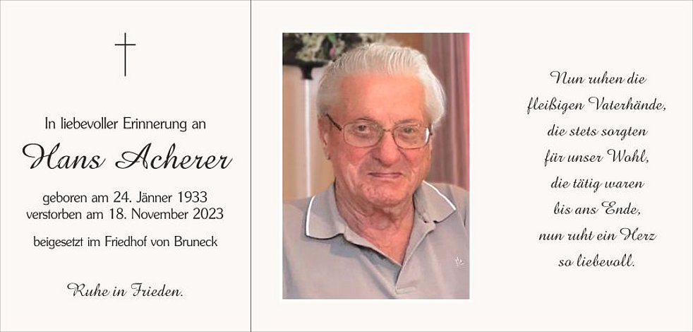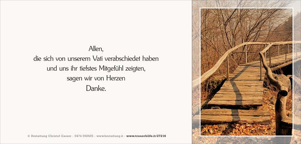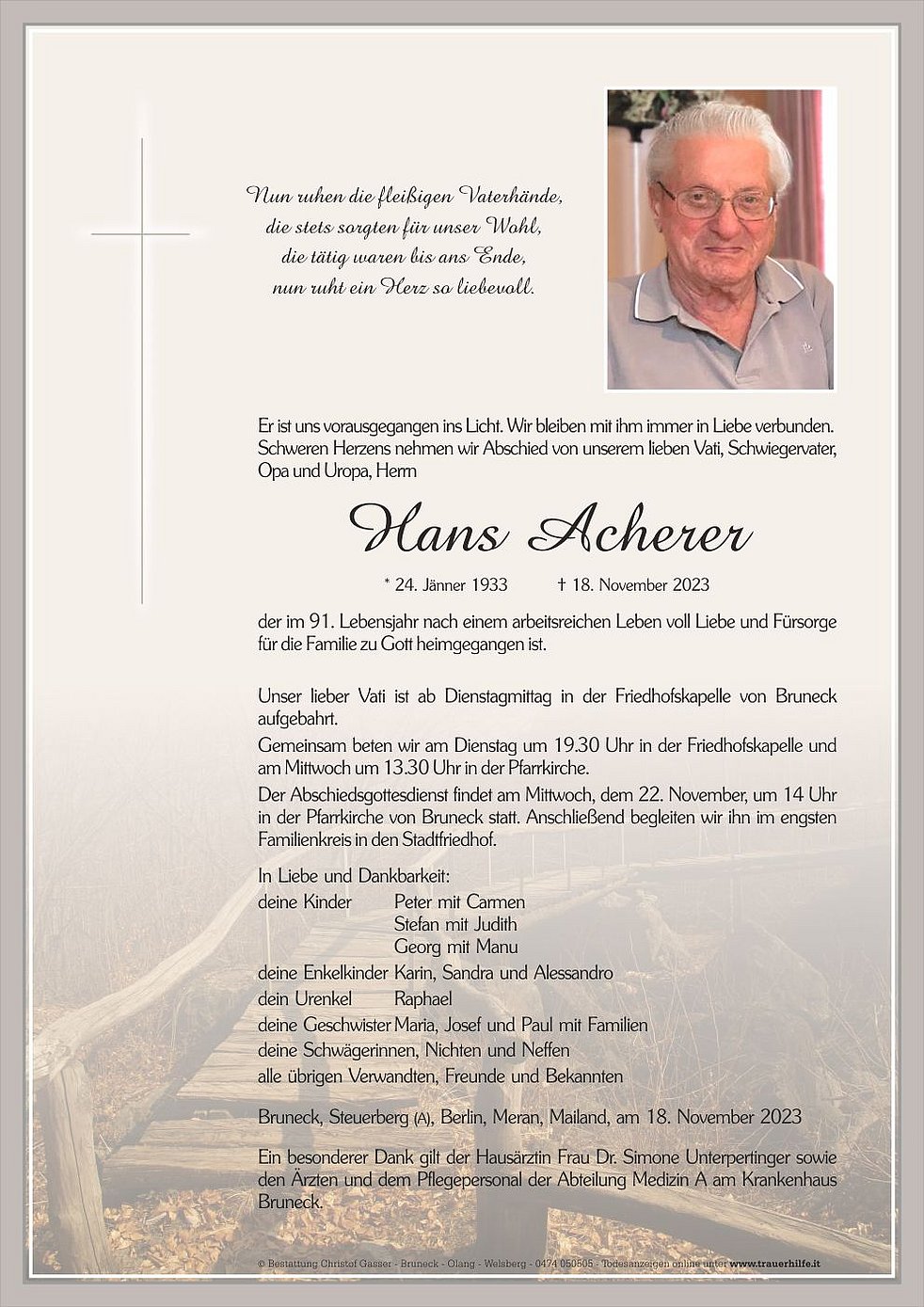 Der Abschiedsgottesdienst findet am Mittwoch, dem 22. November, um 14 Uhr in der Pfarrkirche von Bruneck statt. Anschließend begleiten wir ihn im engsten Familienkreis in den Stadtfriedhof.