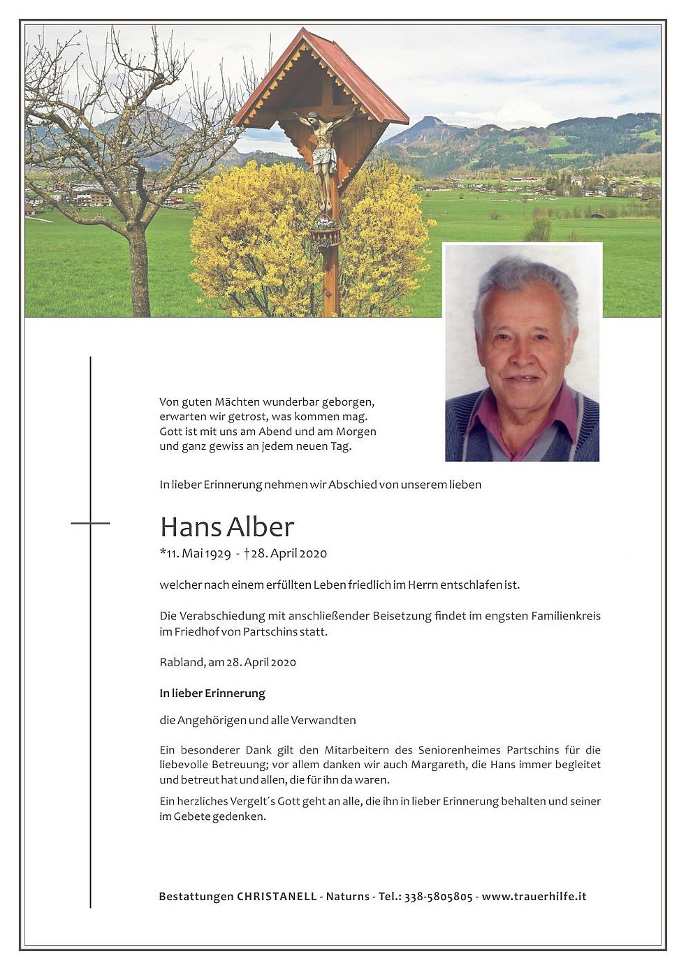 Ein besonderer Dank gilt den Mitarbeitern des Seniorenheimes Partschins für die liebevolle Betreuung; vor allem danken wir auch Margareth, die Hans immer begleitet und betreut hat und allen, die für ihn da waren.