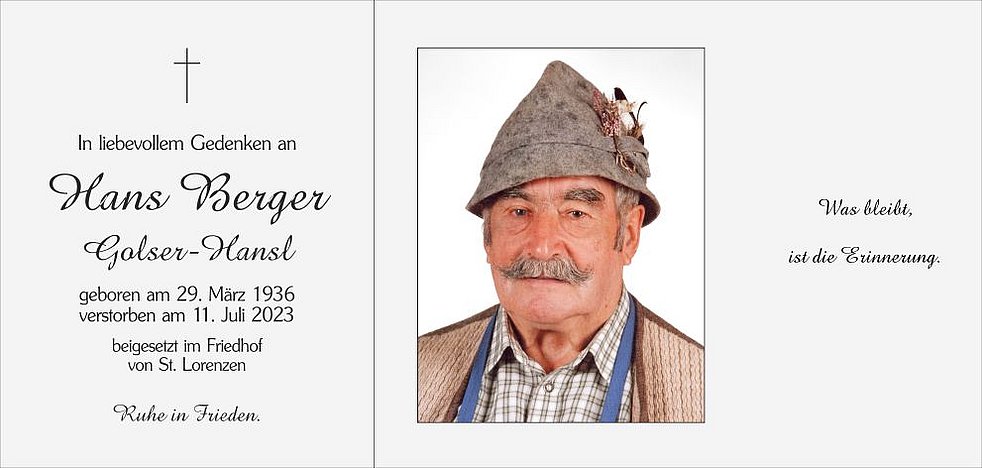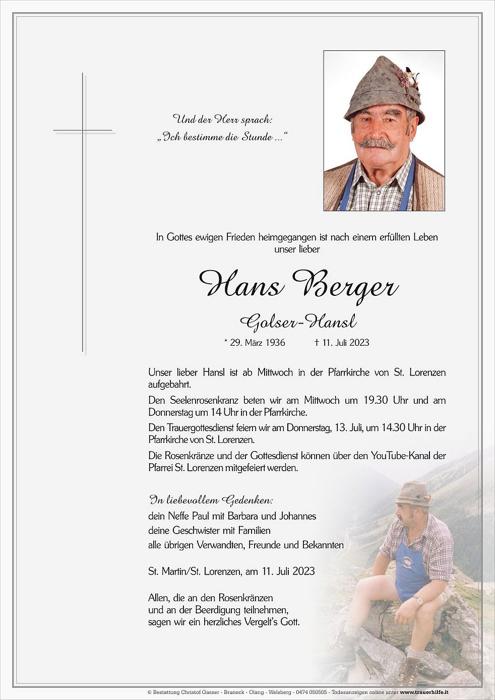 Den Trauergottesdienst feiern wir am Donnerstag, 13. Juli, um 14.30 Uhr in der Pfarrkirche von St. Lorenzen.