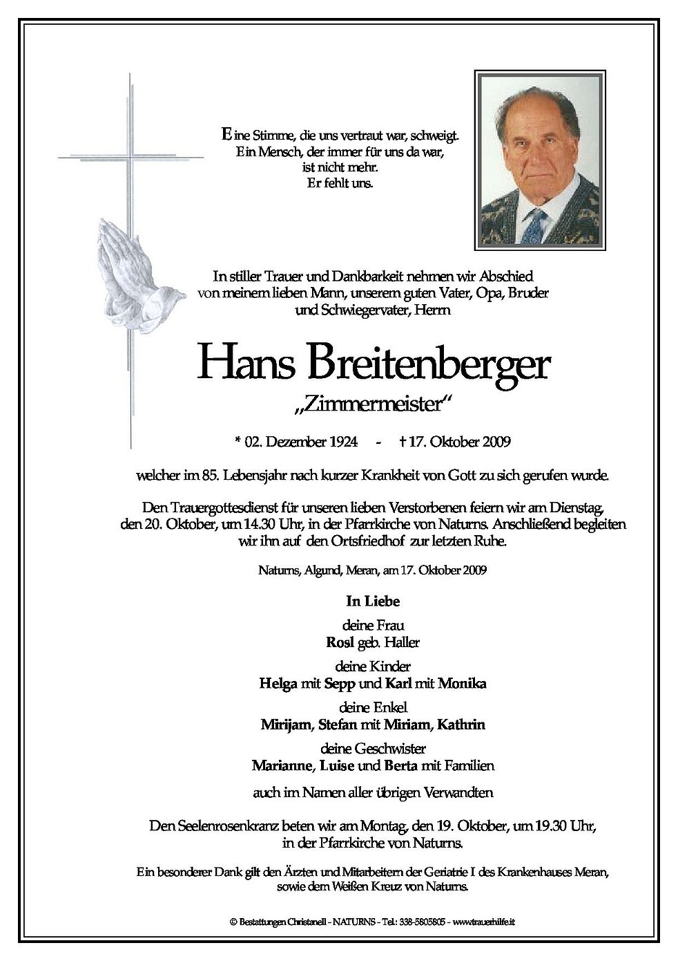 Den Trauergottesdienst für unseren lieben Verstorbenen feiern wir am Dienstag, den 20. Oktober, um 14.30 Uhr, in der Pfarrkirche von Naturns. Anschließend begleiten wir ihn auf den Ortsfriedhof zur letzten Ruhe.