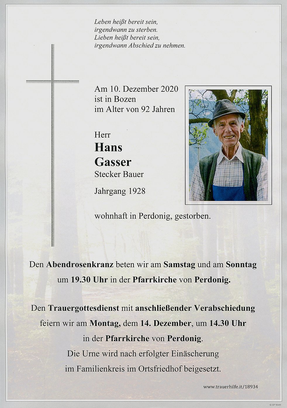 Den Trauergottesdienst mit anschließender Verabschiedung feiern wir am Montag, dem 14. Dezember um 14.30 Uhr in der Pfarrkirche von Perdonig.
