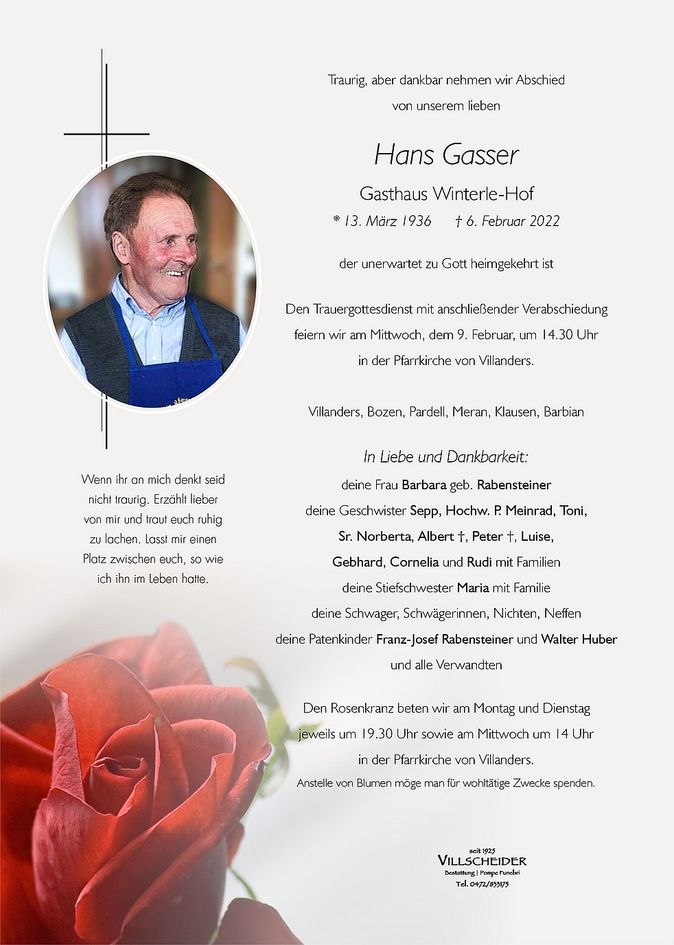 Ach Hons so schnell und still bisch gongen jetzt,gfaid olm hon i mi,wenn dorzählt hosch, von Zeiten de schiano worn wia jetzt. Danke sog i Dir,für dein steht's Vertrauen, wenn i Villonders fohr, wear i olm awian zu dir aui schauen. Herzliches Beileid, Helli Schenk mit Fam.