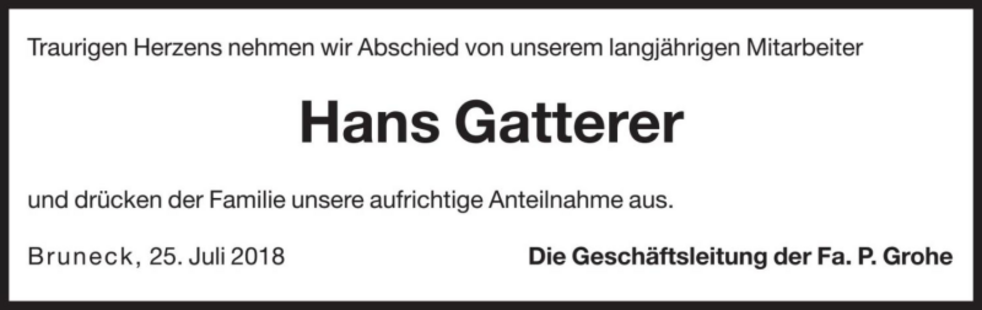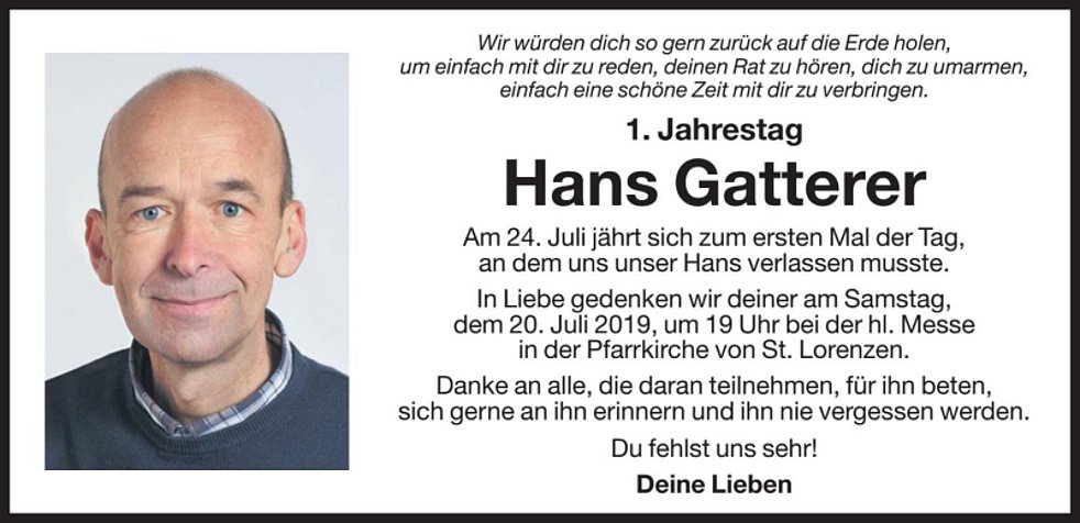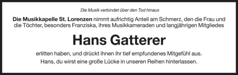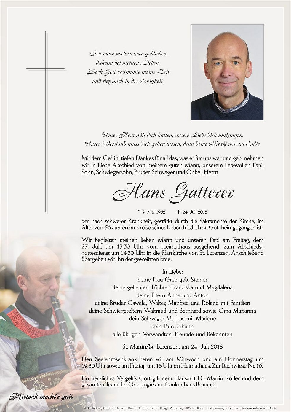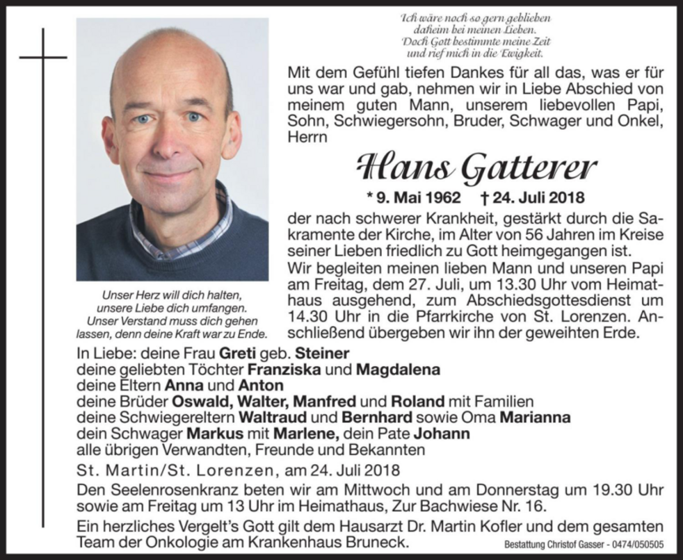 Wir begleiten meinen lieben Mann und unseren Papi am Freitag, dem 27. Juli, um 13.30 Uhr vom Heimathaus ausgehend, zum Abschiedsgottesdienst um 14.30 Uhr in die Pfarrkirche von St. Lorenzen. Anschließend übergeben wir ihn der geweihten Erde.