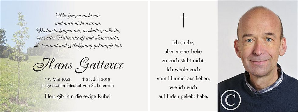 Mit dem Gefühl tiefen Dankes für all das, was er für uns war und gab, nehmen wir in Liebe Abschied von meinem guten Mann, unserem liebevollen Papi, Sohn, Schwiegersohn, Bruder, Schwager und Onkel, Herrn