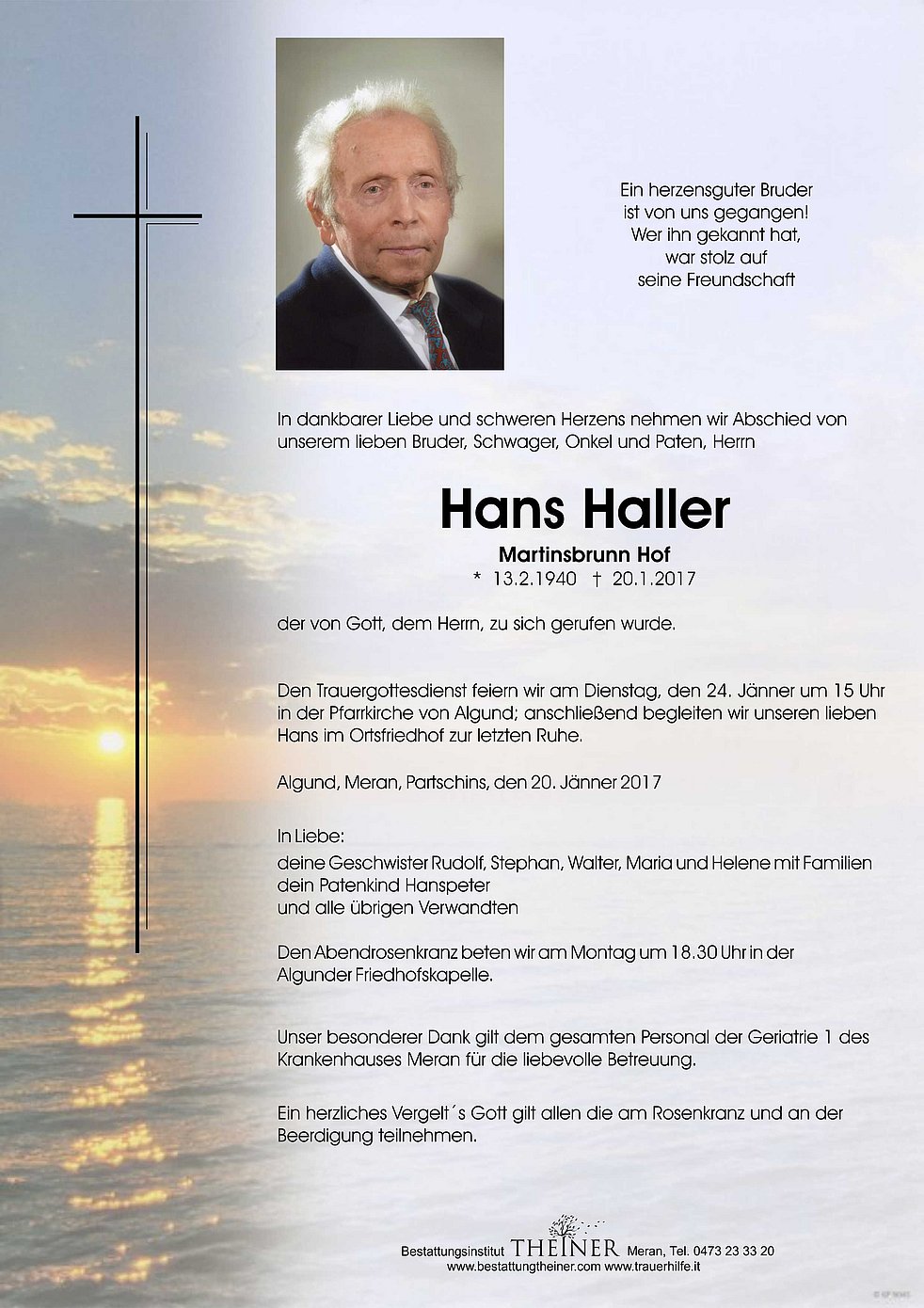 Den Trauergottesdienst feiern wir am Dienstag, den 24. Jänner um 15 Uhr in der Pfarrkirche von Algund; anschließend begleiten wir unseren lieben Hans im Ortsfriedhof zur letzten Ruhe.