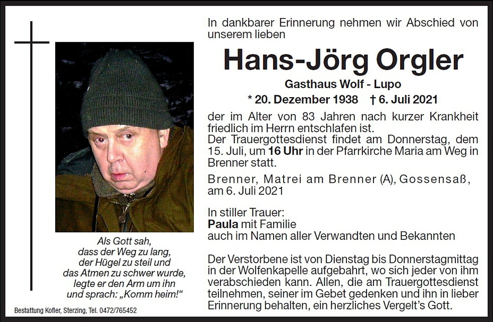 Der Trauergottesdienst findet am Donnerstag, dem 15. Juli, um 16.00 Uhr in der Pfarrkirche Maria am Weg in Brenner statt.