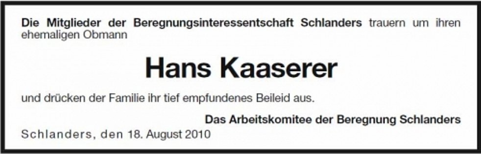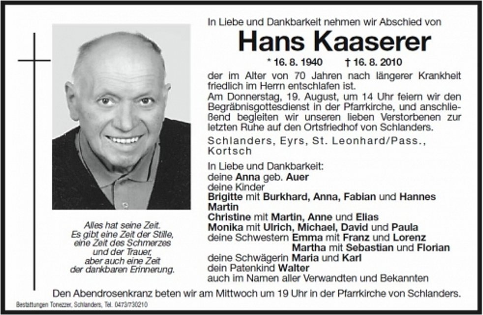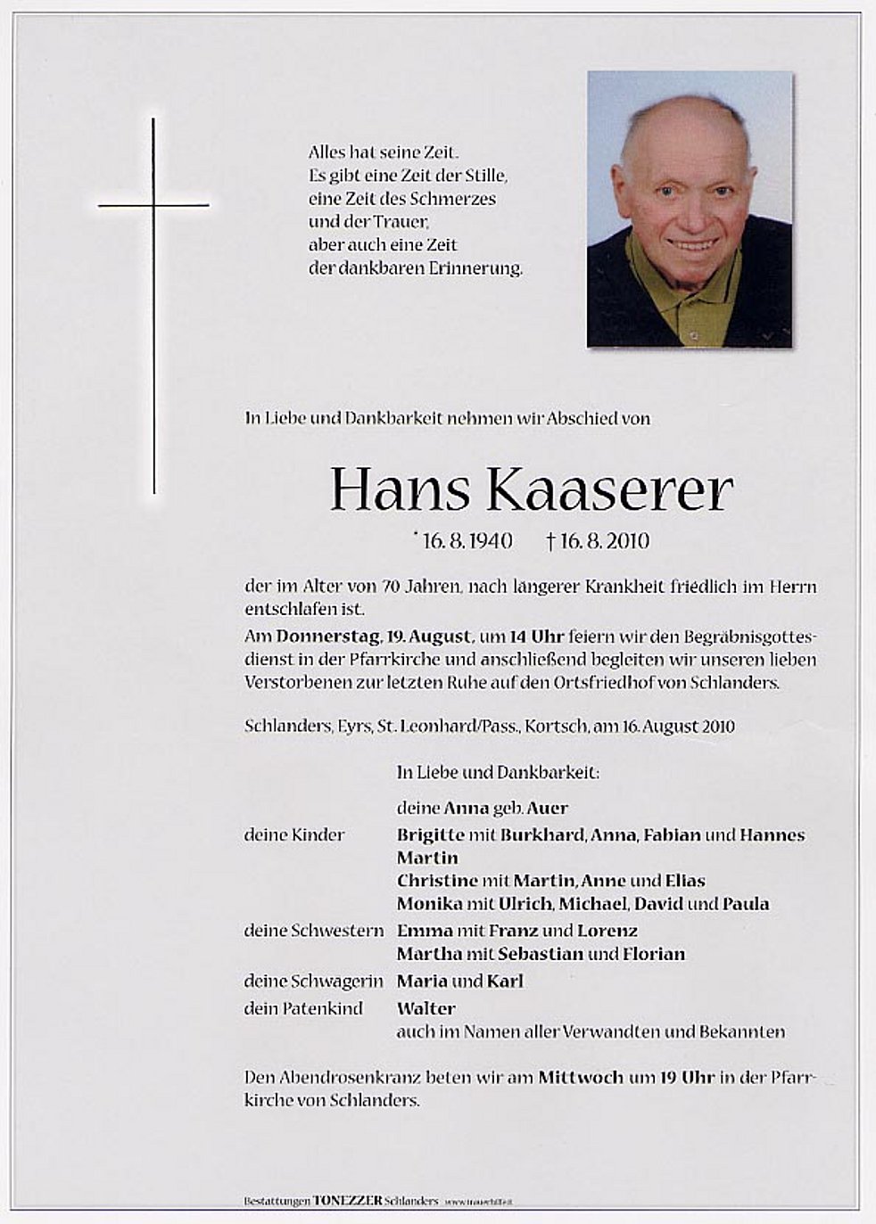 Am Donnerstag, 19. August, um 14 Uhr feiern wir den Begräbnisgottesdienst in der Pfarrkirche und anschließend begleiten wir unseren lieben Verstorbenen zur letzten Ruhe auf den Ortsfriedhof von Schlanders.