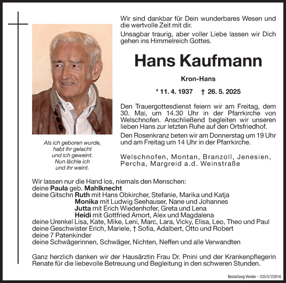 Den Trauergottesdienst feiern wir am Freitag, den 30. Mai, um 14.30 Uhr in der Pfarrkirche von Welschnofen. Anschließend begleiten wir unseren lieben Hans zur letzten Ruhe auf den Ortsfriedhof.
