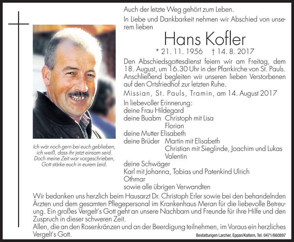 Wir bedanken uns herzlich beim Hausarzt Dr. Christoph Erler, sowie bei den behandelnden Ärzten und dem gesamten Pflegepersonal im Krankenhaus Meran für die liebevolle Betreuung.