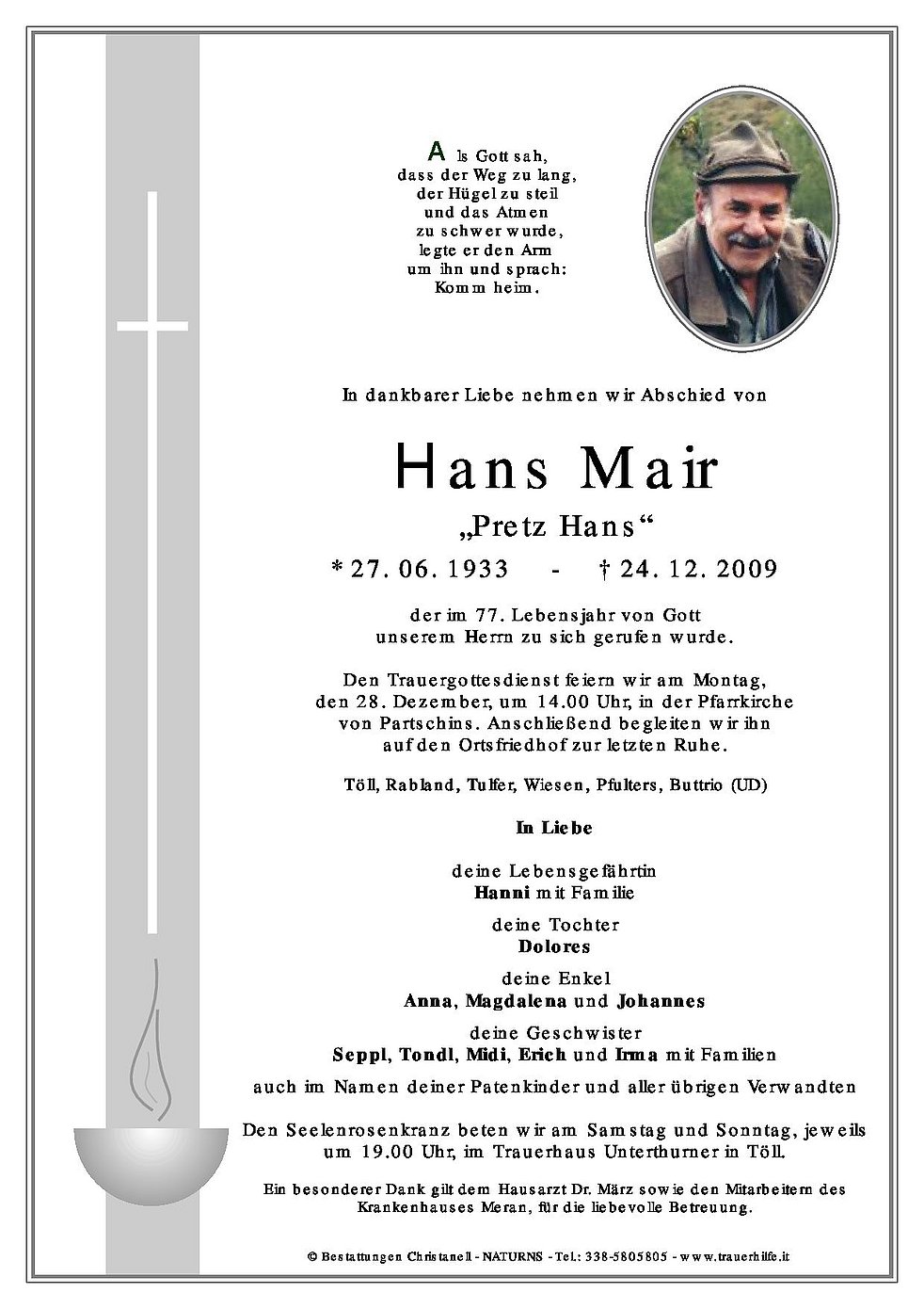 Den Trauergottesdienst feiern wir am Montag, den 28. Dezember, um 14.00 Uhr, in der Pfarrkirche von Partschins. Anschließend begleiten wir ihn auf den Ortsfriedhof zur letzten Ruhe.
