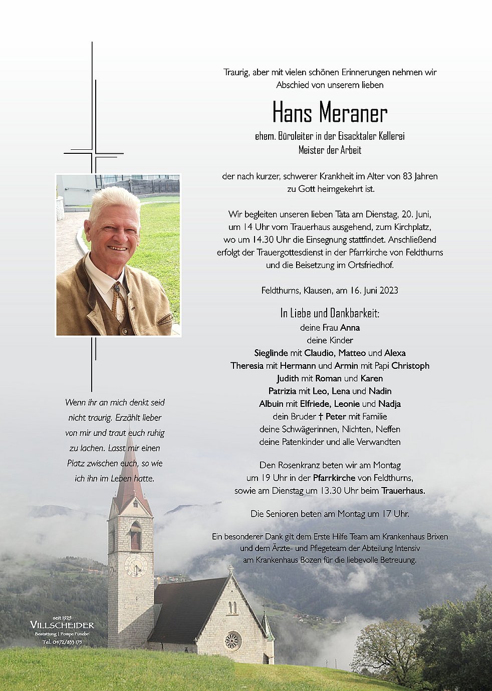 Trauerfeier: 20.06. - 14:30 Uhr Feldthurns