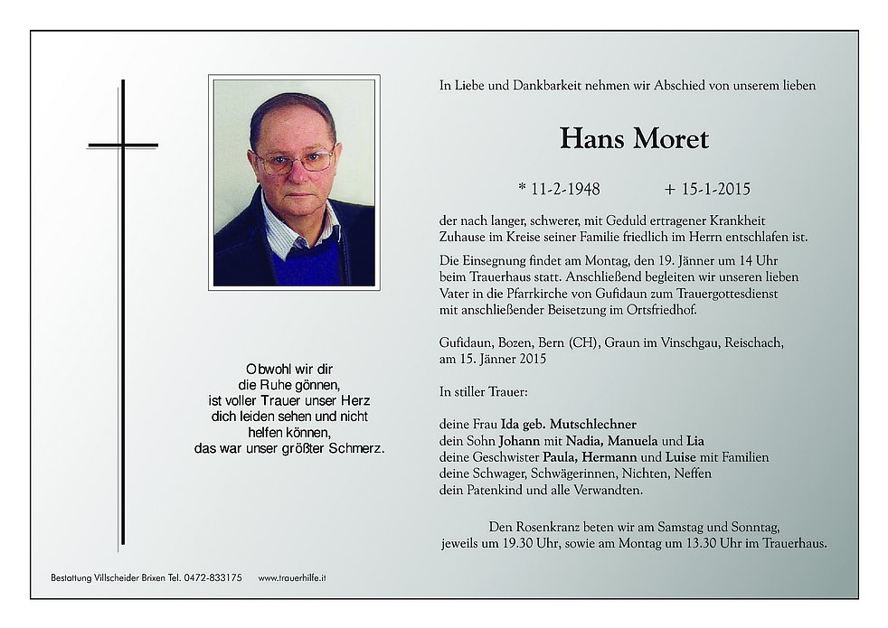 beim Trauerhaus statt. Anschließend begleiten wir unseren lieben Vater in die Pfarrkirche von Gufidaun zum Trauergottesdienst