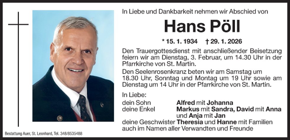 Den Trauergottesdienst mit anschließender Beisetzung feiern wir am Dienstag, 3. Februar, um 14.30 Uhr in der Pfarrkirche von St. Martin.