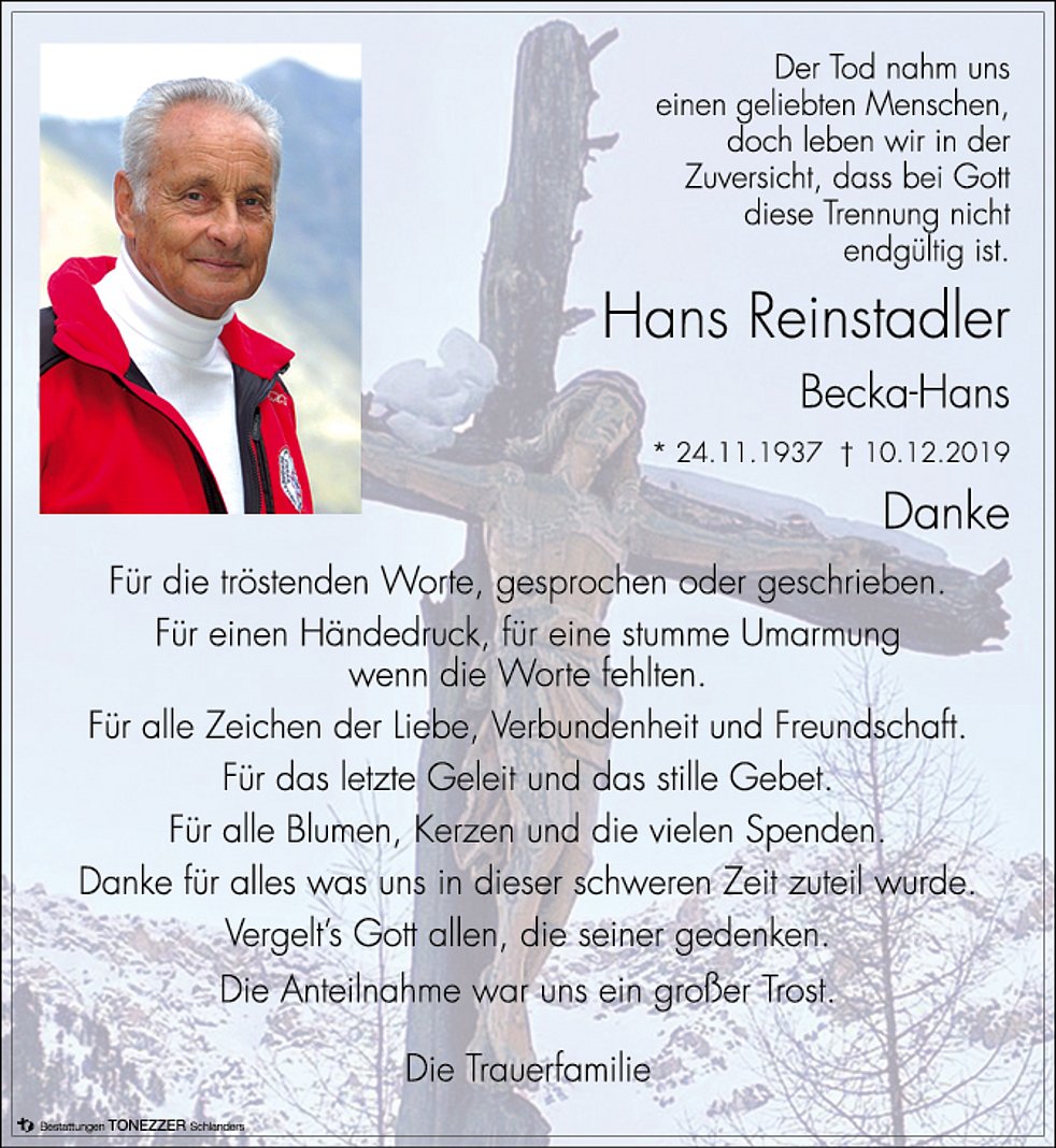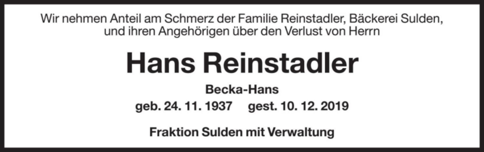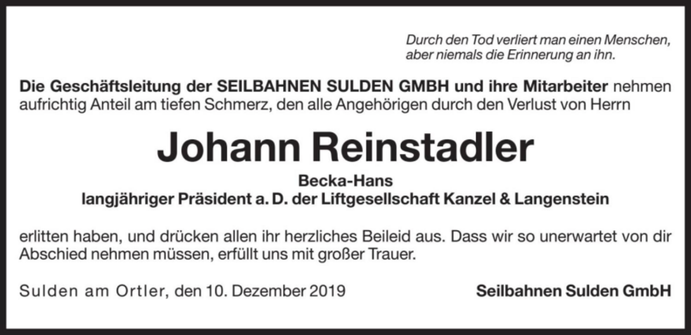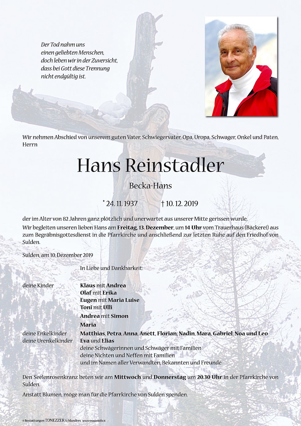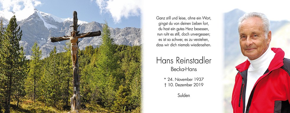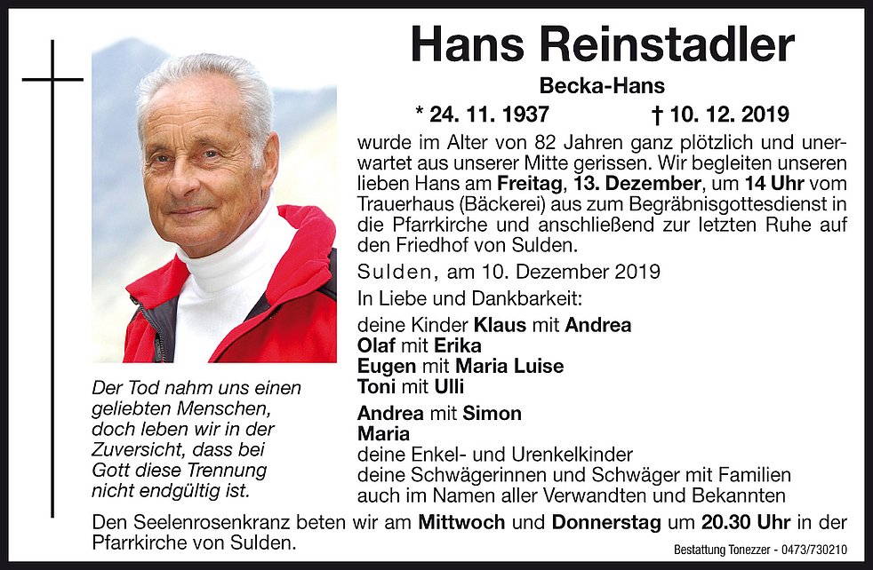 Wir begleiten unseren lieben Hans am Freitag, 13. Dezember, um 14 Uhr vom Trauerhaus (Bäckerei) aus zum Begräbnisgottesdienst in die Pfarrkirche und anschließend zur letzten Ruhe auf den Friedhof von Sulden.