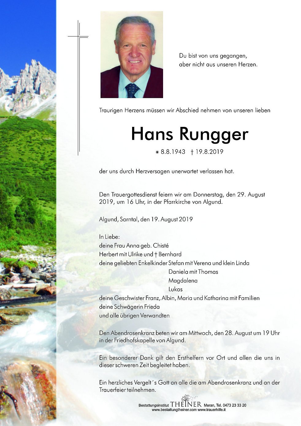 Den Trauergottesdienst feiern wir am Donnerstag, den 29. August 2019, um 16 Uhr, in der Pfarrkirche von Algund.