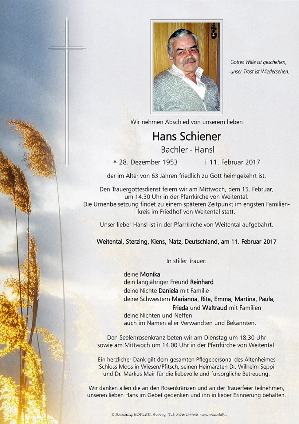 Ein herzlicher Dank gilt dem gesamten Pflegepersonal des Altenheimes Schloss Moos in Wiesen/Pfitsch, seinen Heimärzten Dr. Wilhelm Seppi und Dr. Markus Mair für die liebevolle und fürsorgliche Betreuung.