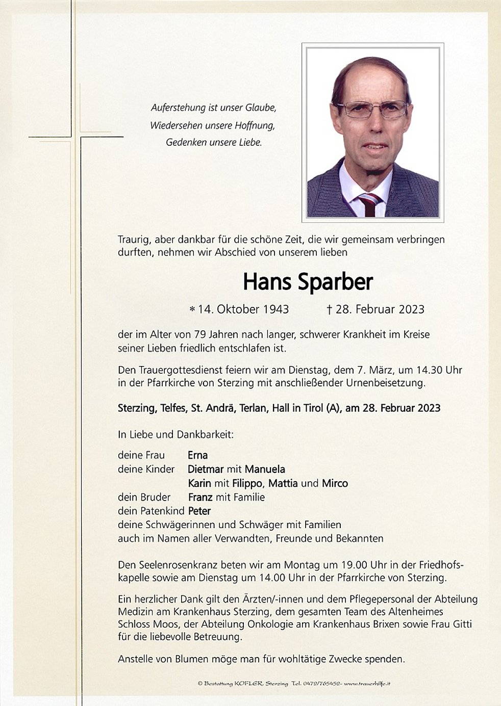 Den Trauergottesdienst feiern wir am Dienstag, dem 7. März, um 14.30 Uhr in der Pfarrkirche von Sterzing mit anschließender Urnenbeisetzung.