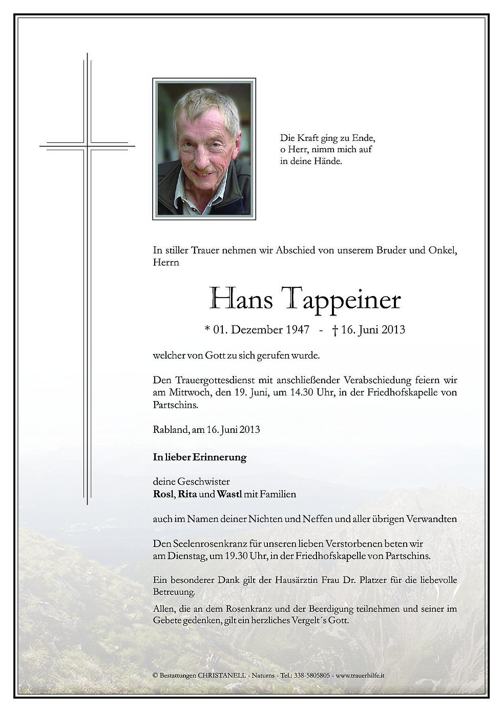 Den Trauergottesdienst mit anschließender Verabschiedung feiern wir am Mittwoch, den 19. Juni, um 14.30 Uhr, in der Friedhofskapelle von Partschins.