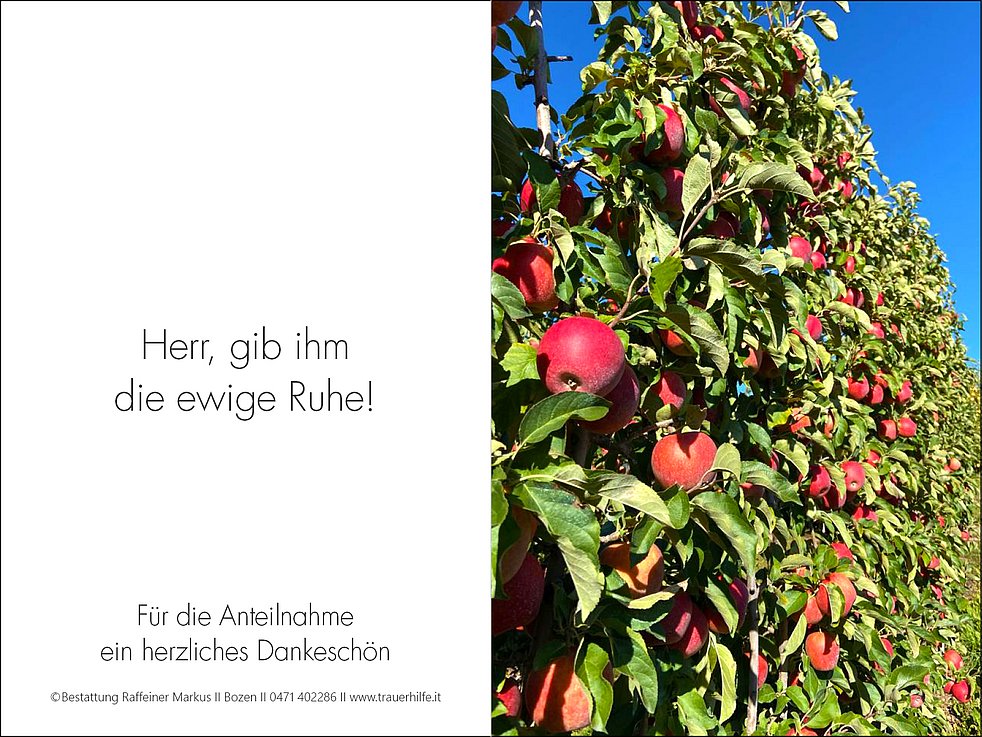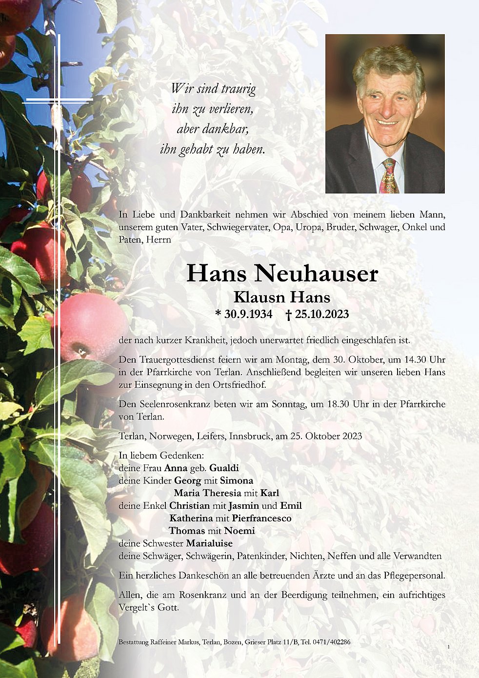 Den Trauergottesdienst feiern wir am Montag, den 30. Oktober, um 14.30 Uhr in der Pfarrkirche von Terlan. Anschließend begleiten wir unseren lieben Hans zur Einsegnung in den Ortsfriedhof.