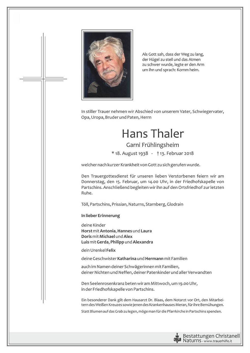 Den Trauergottesdienst für unseren lieben Verstorbenen feiern wir am Donnerstag, den 15. Februar, um 14.00 Uhr, in der Friedhofskapelle von Partschins. Anschließend begleiten wir ihn auf den Ortsfriedhof zur letzten Ruhe.