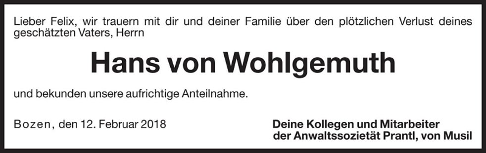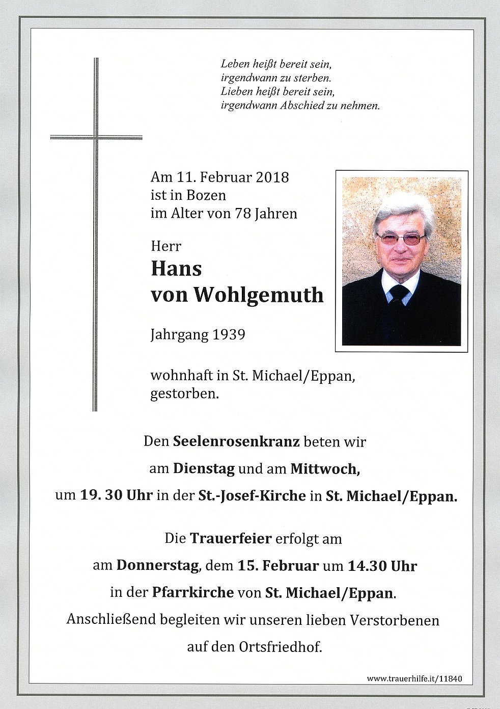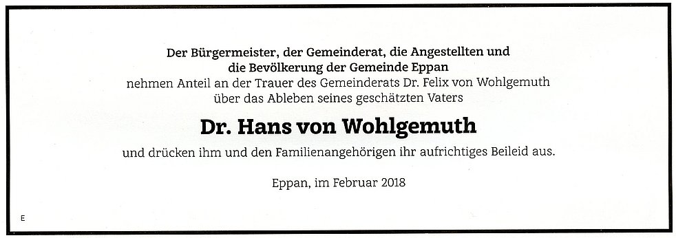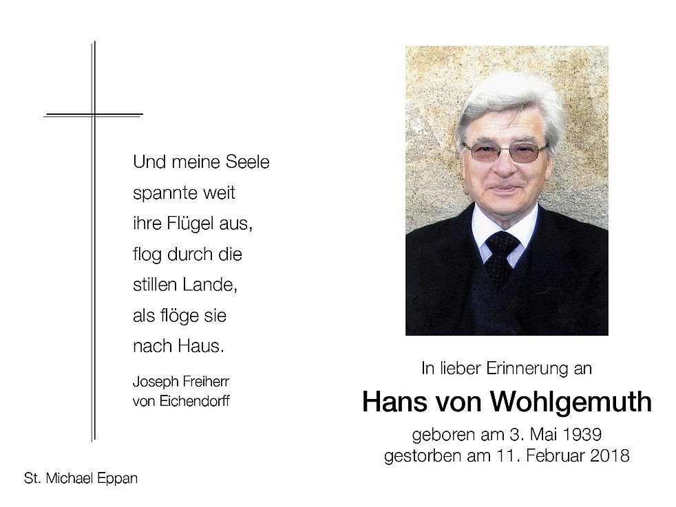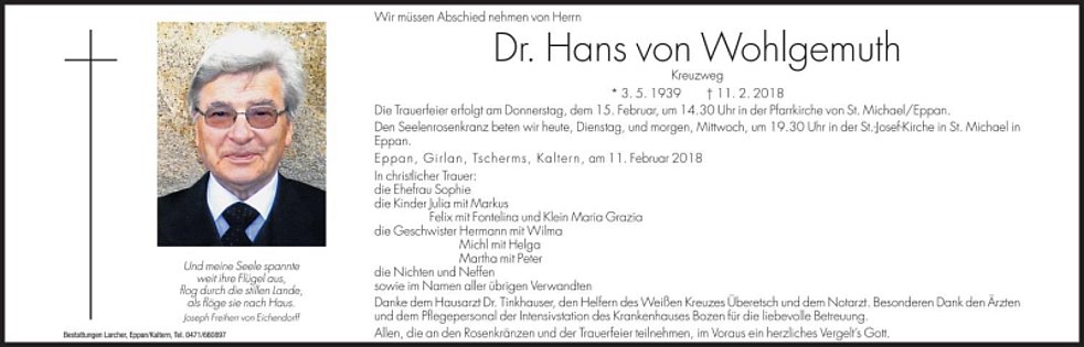 Die Trauerfeier erfolgt am Donnerstag, den 15. Februar um 14.30 Uhr in der Pfarrkirche von St. Michael/Eppan.