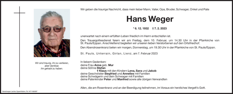 Den Trauergottesdienst feiern wir am Freitag, dem 10. Februar um 14.30 Uhr in der Pfarrkirche von St. Pauls/Eppan. Anschließend begleiten wir unseren lieben Verstorbenen auf den Ortsfriedhof.