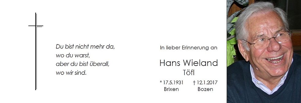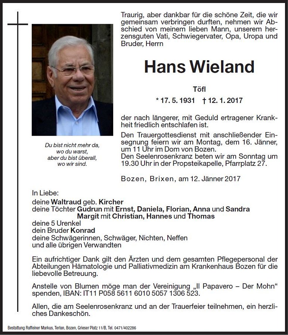 Den Trauergottesdienst mit anschlieβender Einsegnung feiern wir am Montag, den 16. Jänner, um 11 Uhr im Dom von Bozen.