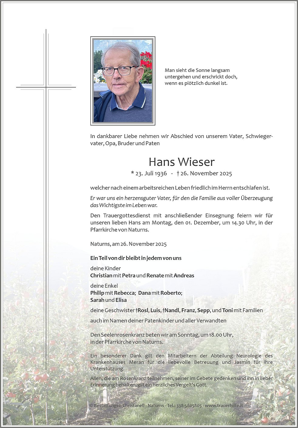 Den Trauergottesdienst mit anschließender Einsegnung feiern wir für unseren lieben Hans am Montag, den 01. Dezember, um 14.30 Uhr, in der Pfarrkirche von Naturns.