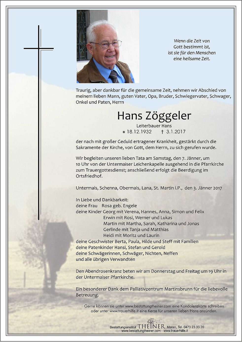 Wir begleiten unseren lieben Tata am Samstag, den 7. Jänner, um 10 Uhr von der Untermaiser Leichenkapelle ausgehend in die
