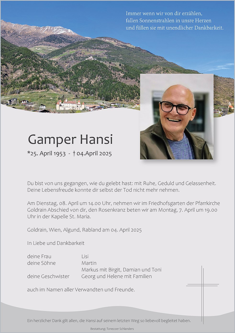 Am Dienstag, 8. April um 14.00 Uhr, nehmen wir im Friedhofsgarten der Pfarrkirche Goldrain Abschied von dir, den Rosenkranz beten wir am Montag, 7. April um 19.00 Uhr in der Kapelle St. Maria.