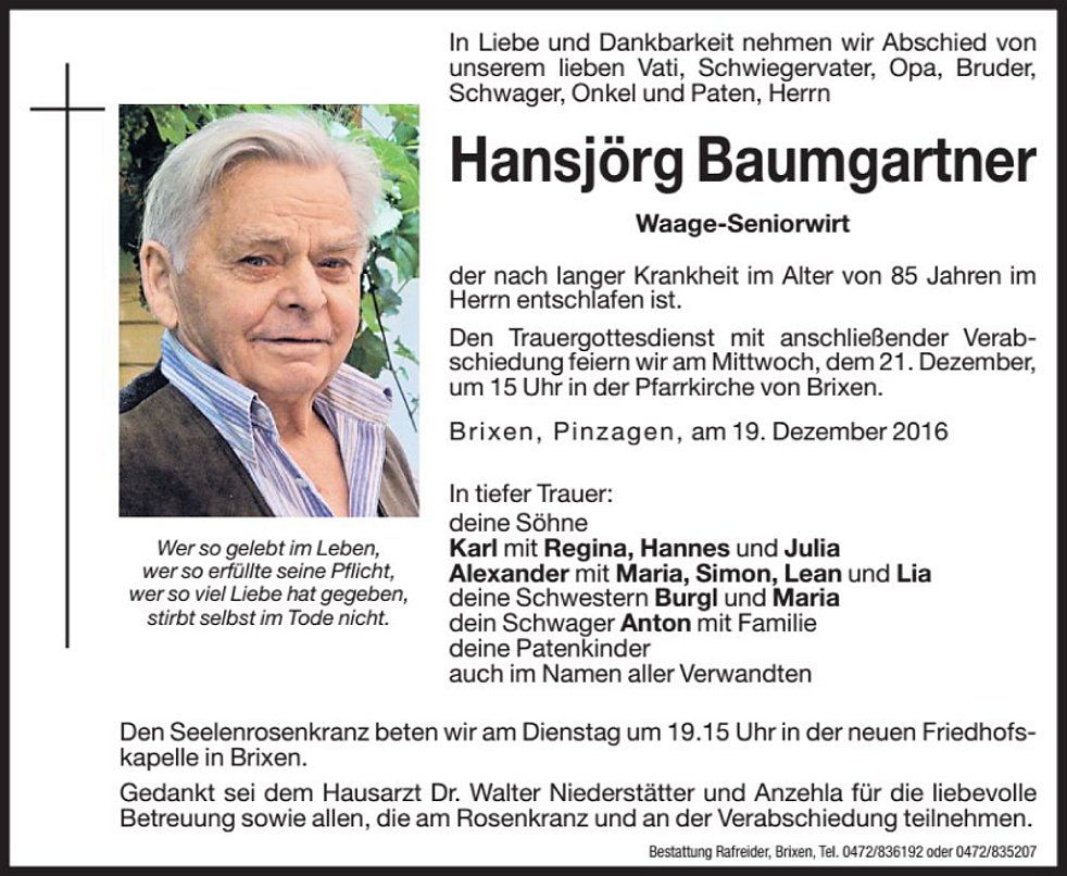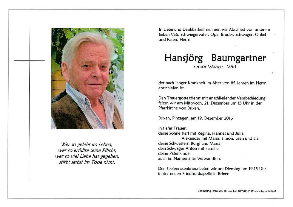 Den Trauergottesdienst mit anschließender Verabschiedung feiern wir am Mittwoch, 21. Dezember um 15 Uhr in der Pfarrkirche von Brixen.