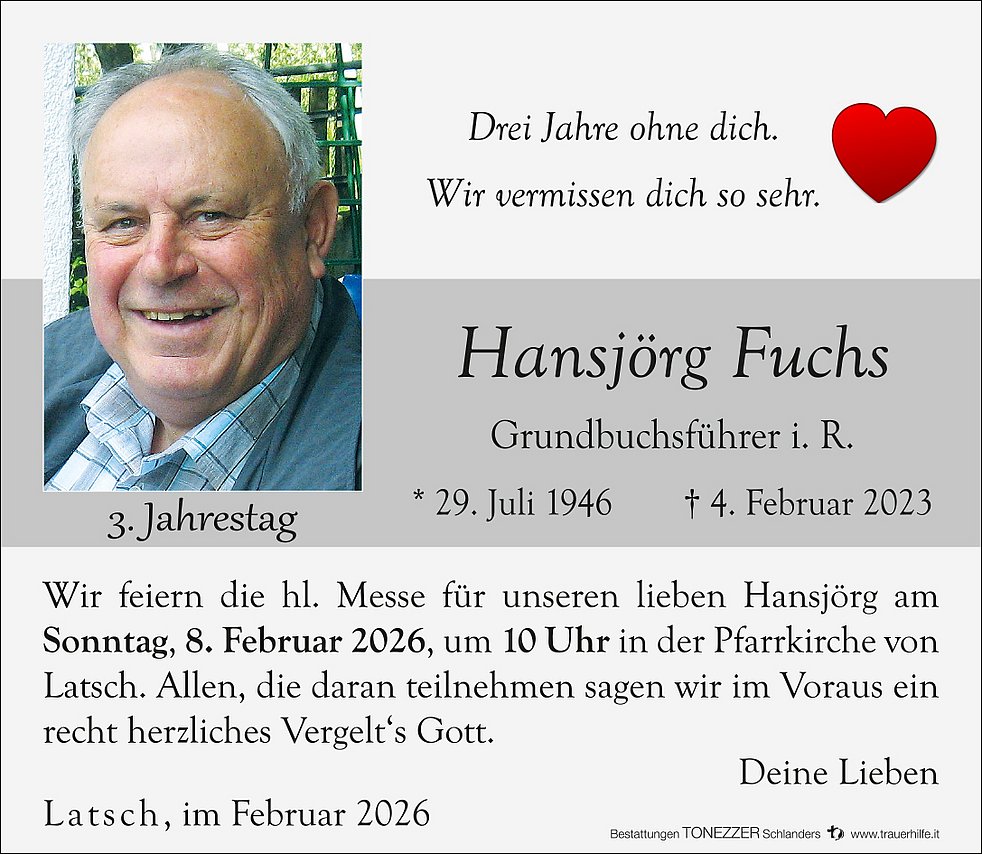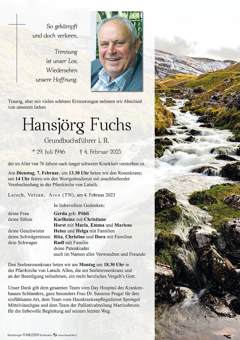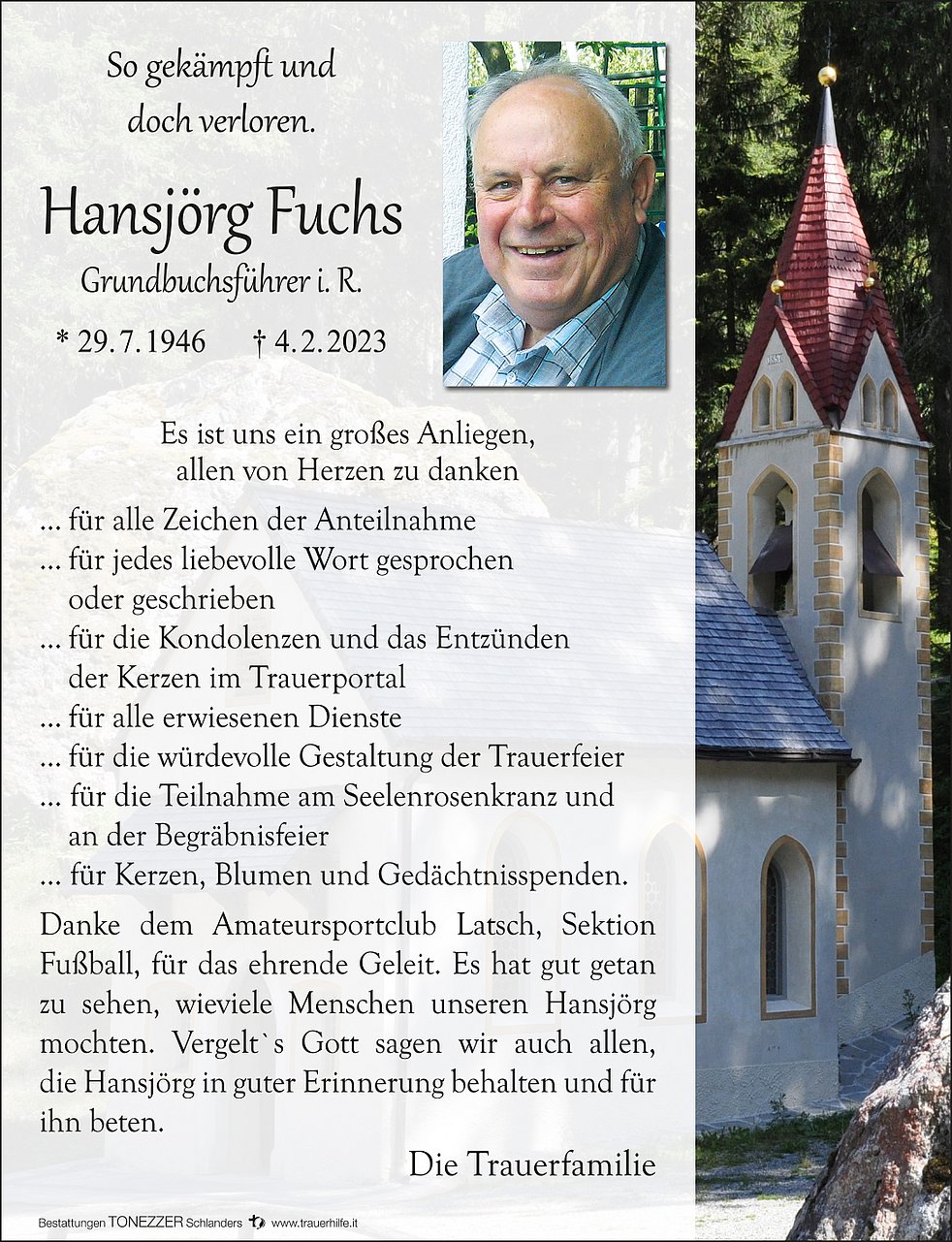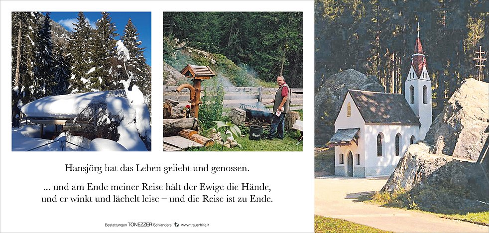Unser Dank gilt dem gesamten Team vom Day Hospital des Krankenhauses Schlanders, ganz besonders Frau Dr. Susanne Pragal für ihre einfühlsame Art, dem Team vom Hauskrankenpflegedienst Sprengel Mittelvinschgau und dem Hausarzt Dr. Josef Plangger sowie dem Team der Palliativabteilung Martinsbrunn für die liebevolle Begleitung auf seinem letzten Weg.