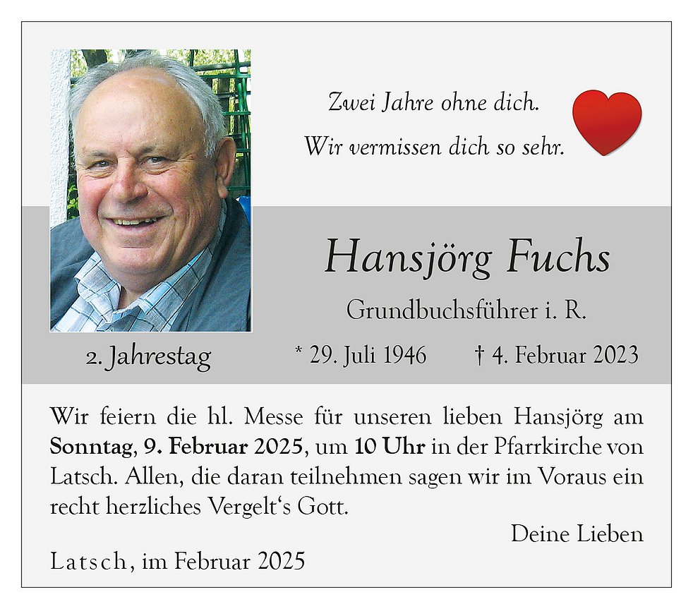 Am Dienstag, 7. Februar, um 13.30 Uhr beten wir den Rosenkranz; um 14 Uhr feiern wir den Wortgottesdienst mit anschließender Verabschiedung in der Pfarrkirche von Latsch.