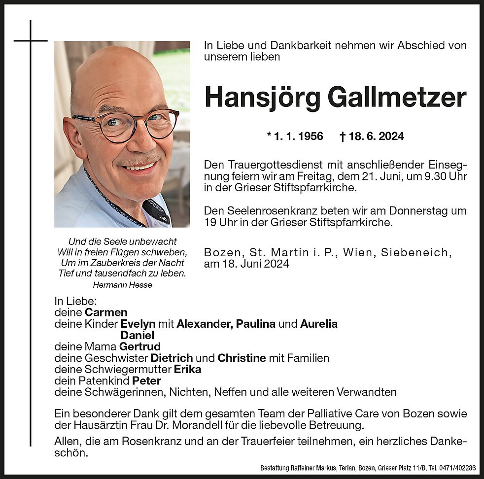 Ein besonderer Dank gilt dem gesamten Team der Palliativ Care von Bozen sowie der Hausärztin Frau Dr. Morandell für die liebevolle Betreuung.