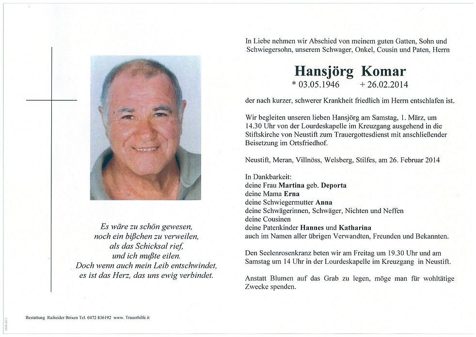 Wir begleiten unseren lieben Hansjörg am Samstag, 1. März, um 14.30 Uhr von der Lourdeskapelle im Kreuzgang ausgehend in die Stiftskirche von Neustift zum Trauergottesdienst mit anschließender Beisetzung im Ortsfriedhof.