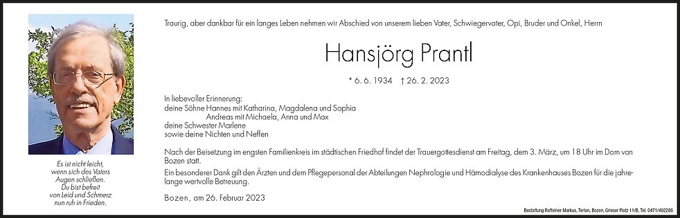 Nach der Beisetzung im engsten Familienkreis im städtischen Friedhof findet der Trauergottesdienst am Freitag, dem 3. März, um 18 Uhr im Dom von Bozen statt.