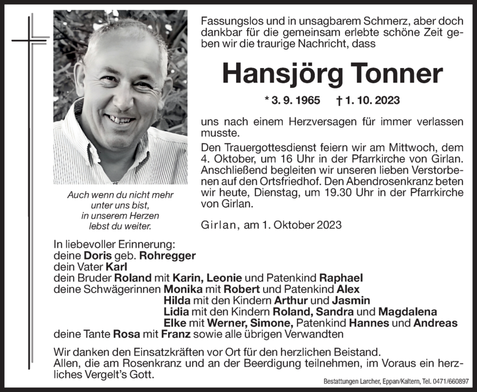 Den Trauergottesdienst feiern wir am Mittwoch, dem 4. Oktober um 16 Uhr in der Pfarrkirche von Girlan. Anschließend begleiten wir unseren lieben Verstorbenen auf den Ortsfriedhof.