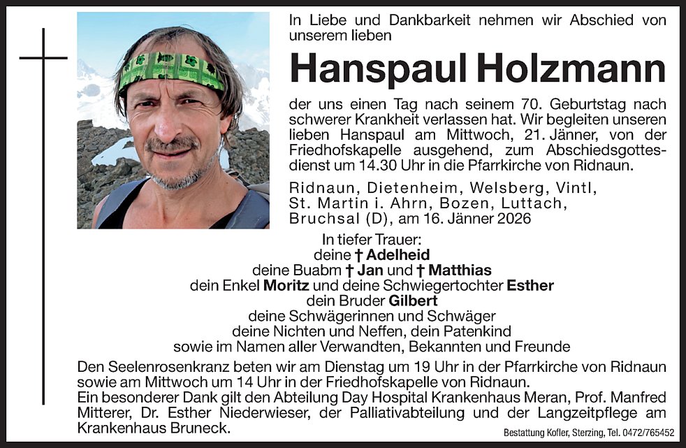 Wir begleiten unseren lieben Hanspaul am Mittwoch, 21. Jänner, von der Friedhofskapelle ausgehend, zum Abschiedsgottesdienst um 14.30 Uhr in die Pfarrkirche von Ridnaun. Die Urne wird zu einem späteren Zeitpunkt im engsten Familienkreis beigesetzt.