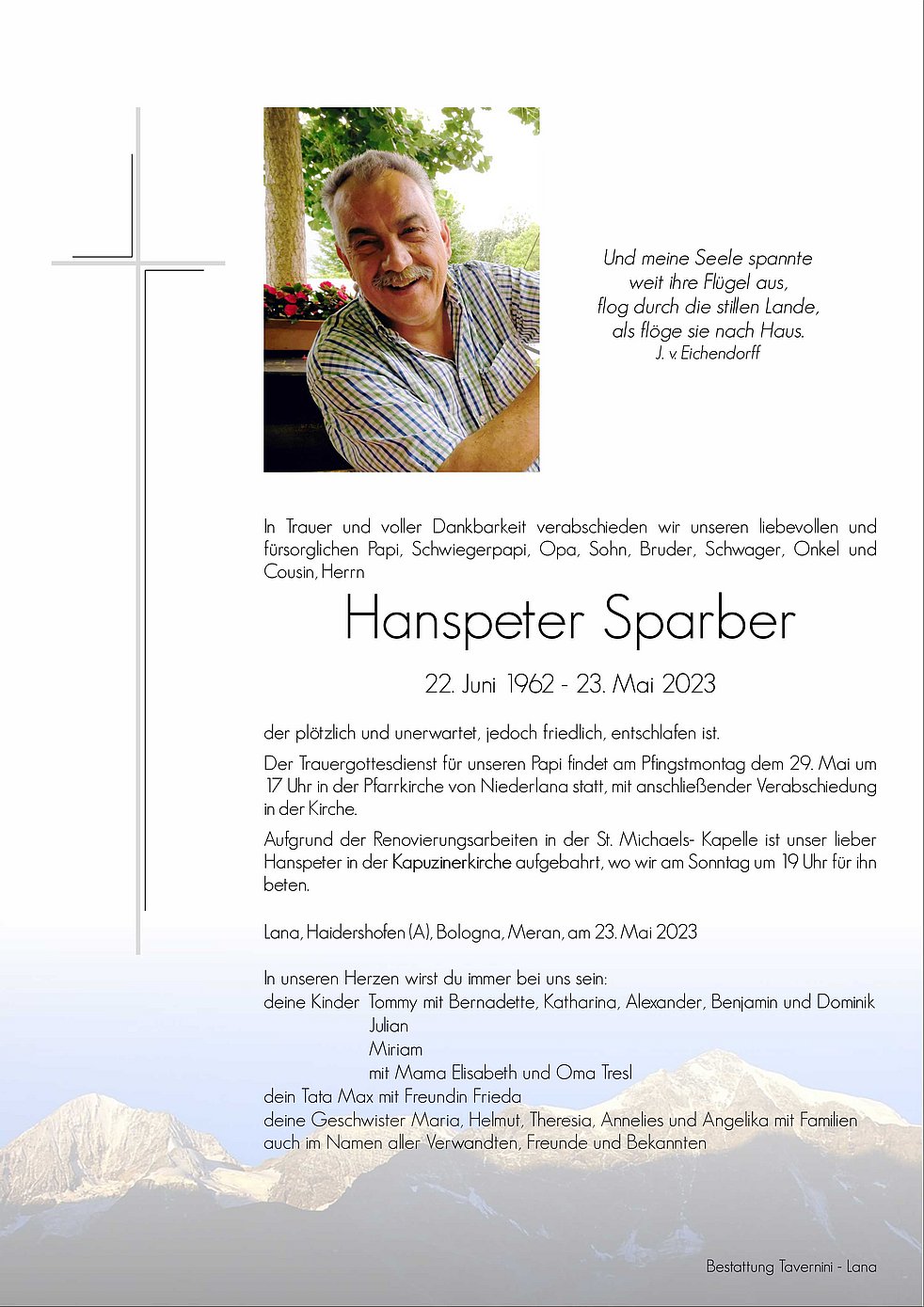 traurig über den plötzlichen Tod von Hanspeter möchte ich Euch mein aufrichtiges Beileid aussprechen. Ich wünsche Euch, daß Ihr in dieser schweren Stunde die Stärke findet, das schwere Schicksal zu ertragen. Tief empfundenes Mitgefühl möge Euch aufrichten und wärmen und herzliche Anteilnahme möge trösten.