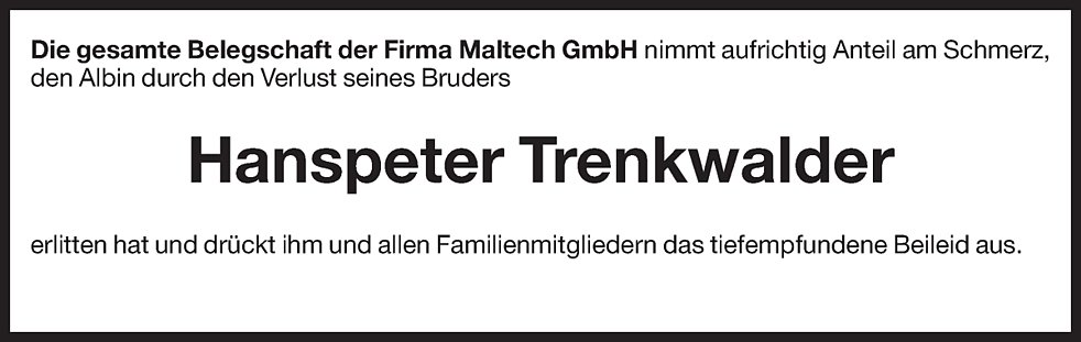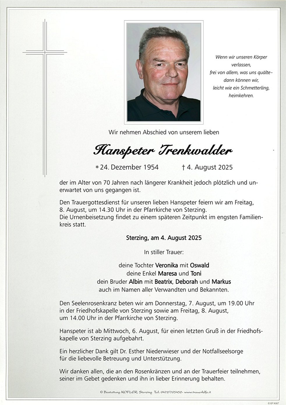 Den Trauergottesdienst für unseren lieben Hanspeter feiern wir am Freitag, 8. August, um 14.30 Uhr in der Pfarrkirche von Sterzing. Die Urnenbeisetzung findet zu einem späteren Zeitpunkt im engsten Familienkreis statt.