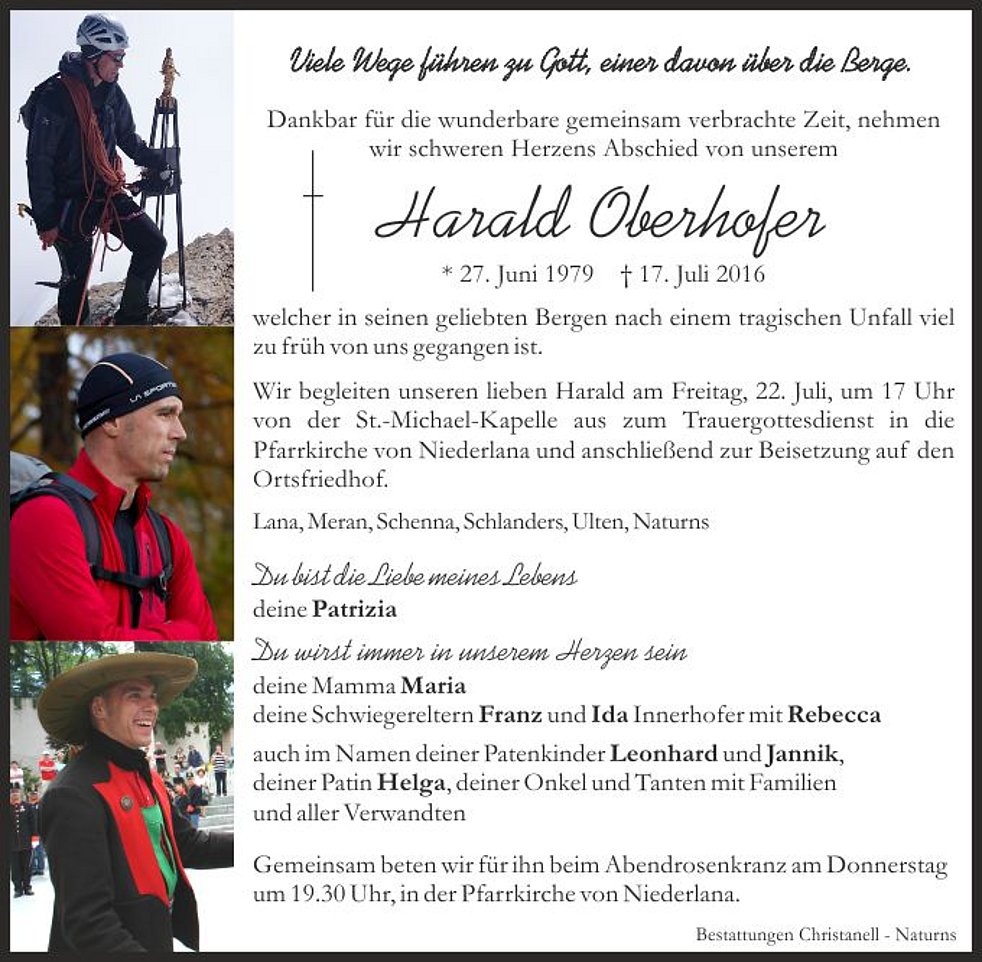 Wir begleiten unseren lieben Harald am Freitag, den 22. Juli, um 17.00 Uhr von der St.-Michael-Kapelle aus zum Trauergottes-dienst in die Pfarrkirche von Niederlana und anschließend zur Beisetzung auf den Ortsfriedhof.