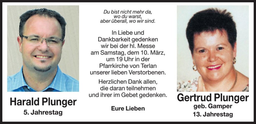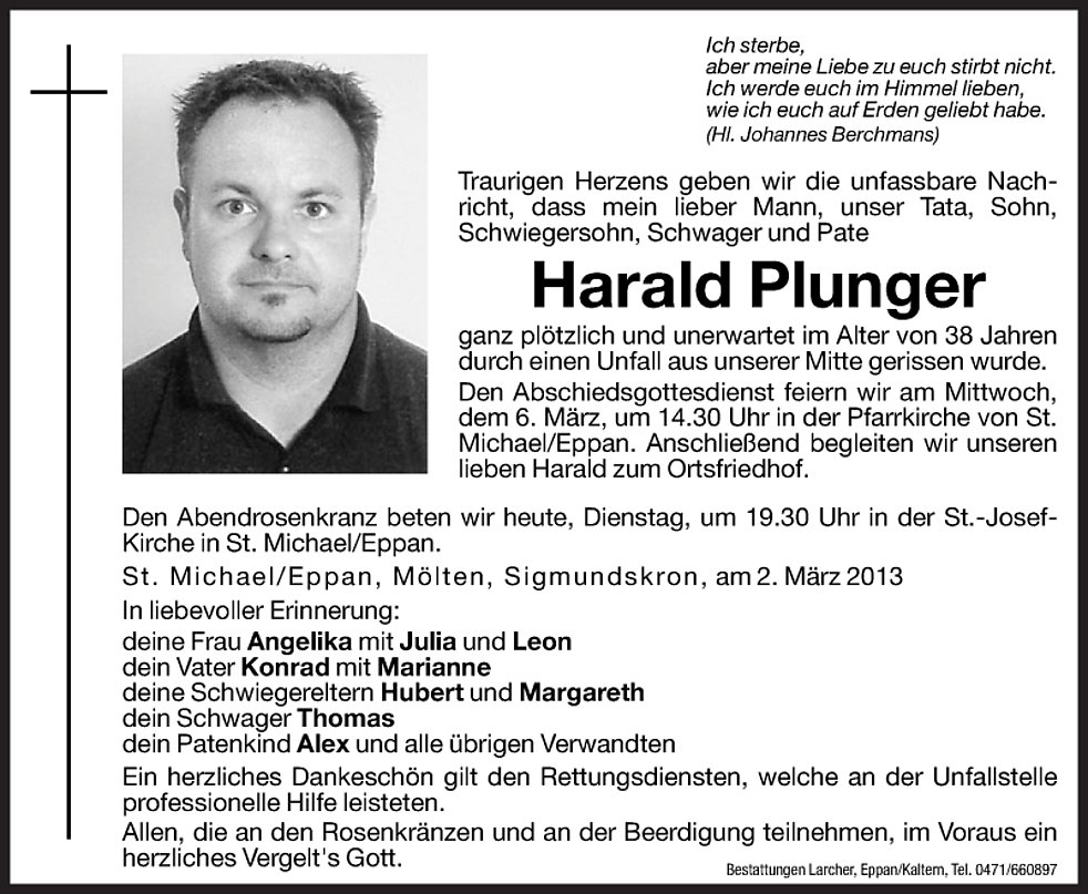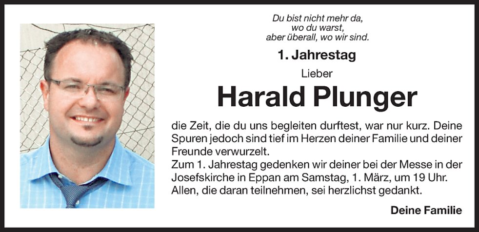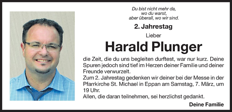 Den Abschiedsgottesdienst feiern wir am Mittwoch, den 6. März, um 14.30 Uhr in der Pfarrkirche von St. Michael/Eppan. Anschließend begleiten wir unseren lieben Harald zum Ortsfriedhof.
