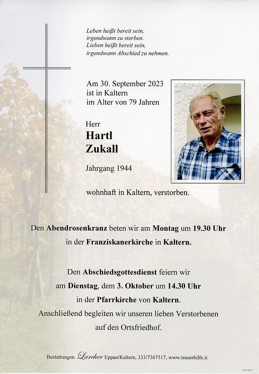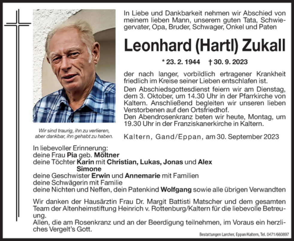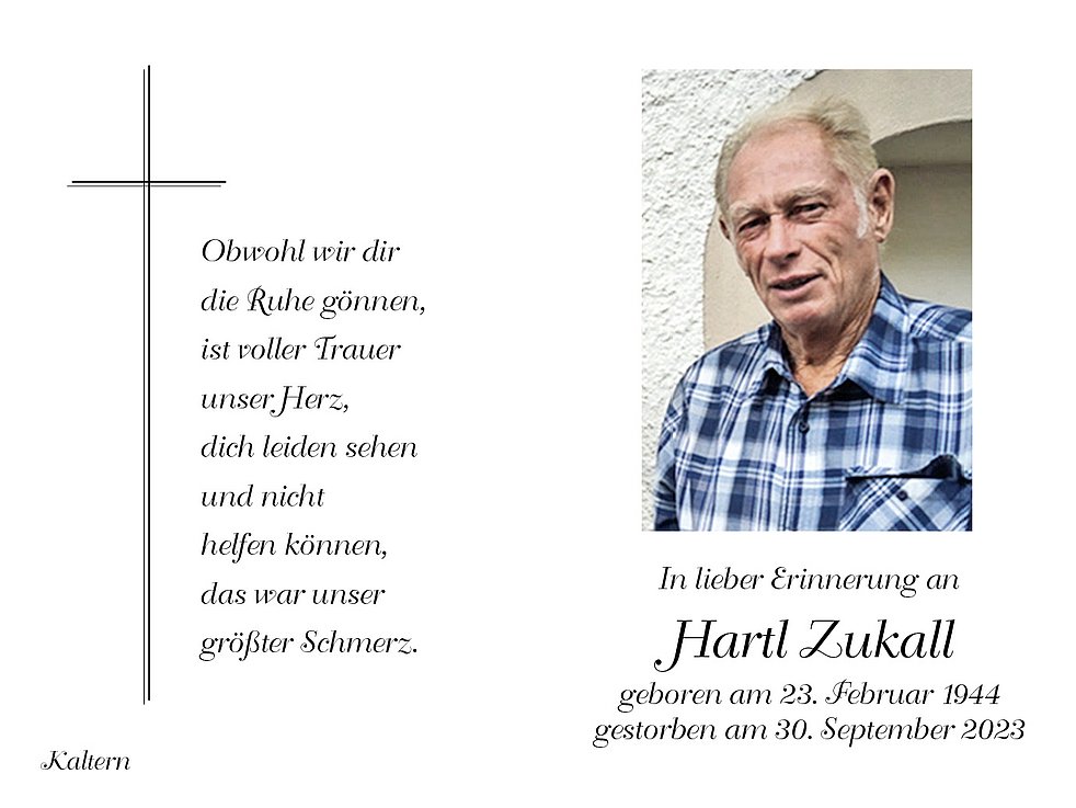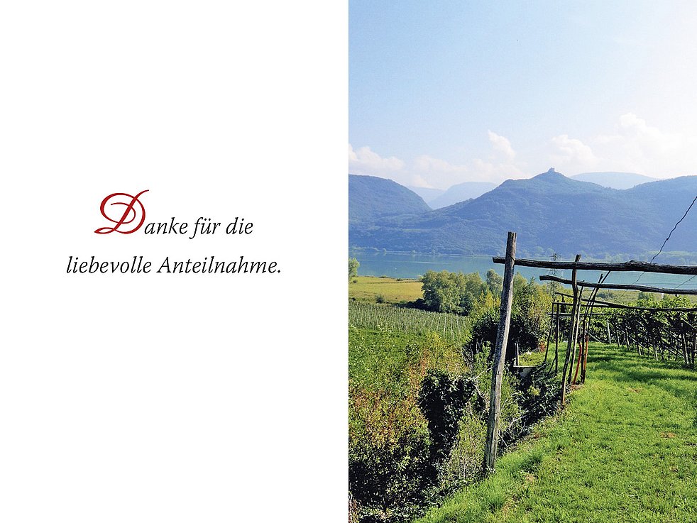 Den Abschiedsgottesdienst feiern wir am Dienstag, dem 3. Oktober um 14.30 Uhr in der Pfarrkirche von Kaltern. Anschließend begleiten wir unseren lieben Verstorbenen auf den Ortsfriedhof.