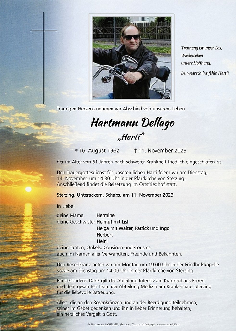 Den Trauergottesdienst für unseren lieben Harti feiern wir am Dienstag, 14. November, um 14.30 Uhr in der Pfarrkirche von Sterzing. Anschließend findet die Beisetzung im Ortsfriedhof statt.