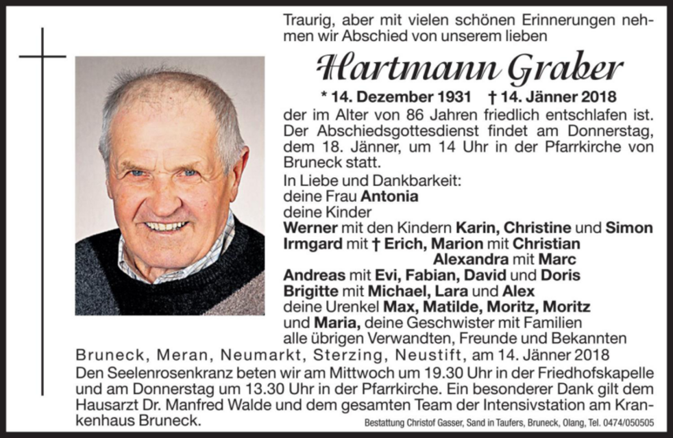 Der Abschiedsgottesdienst findet am Donnerstag, dem 18. Jänner, um14 Uhr in der Pfarrkirche von Bruneck statt.