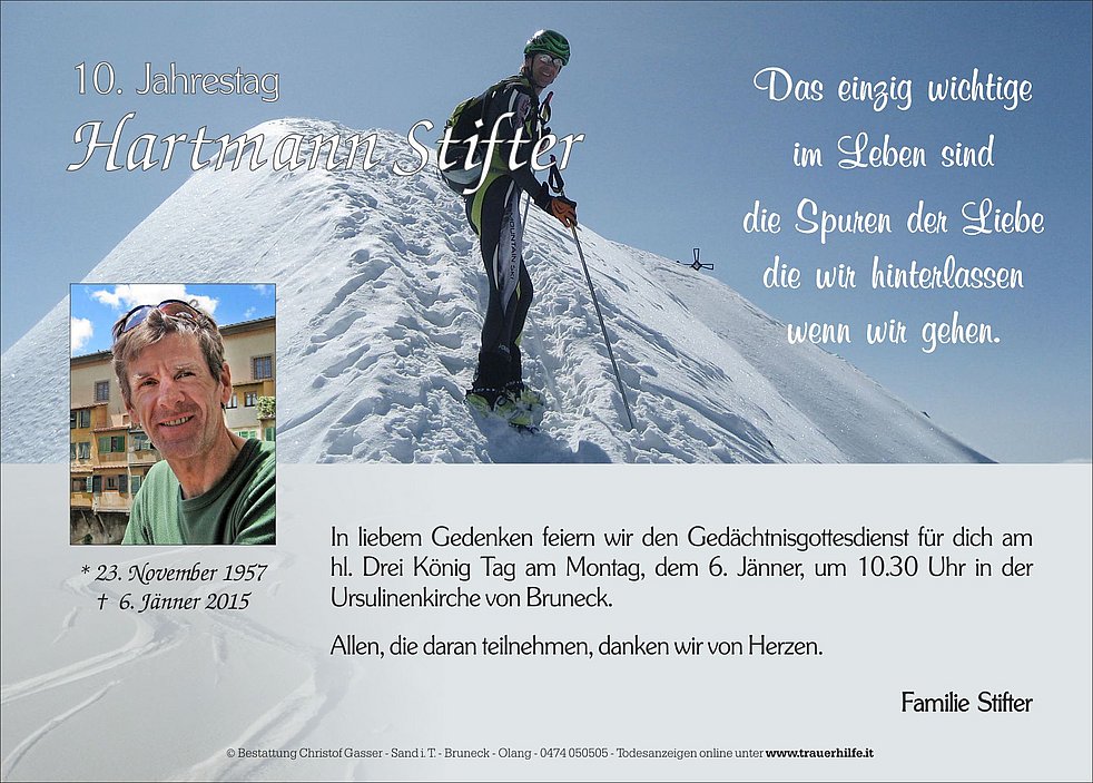 Der Abschiedsgottesdienst findet am Samstag, dem 10. Jänner, um 14 Uhr in der Pfarrkirche von Bruneck statt. Anschließend begleiten wir unseren lieben Hartmann zur letzten Ruhe.