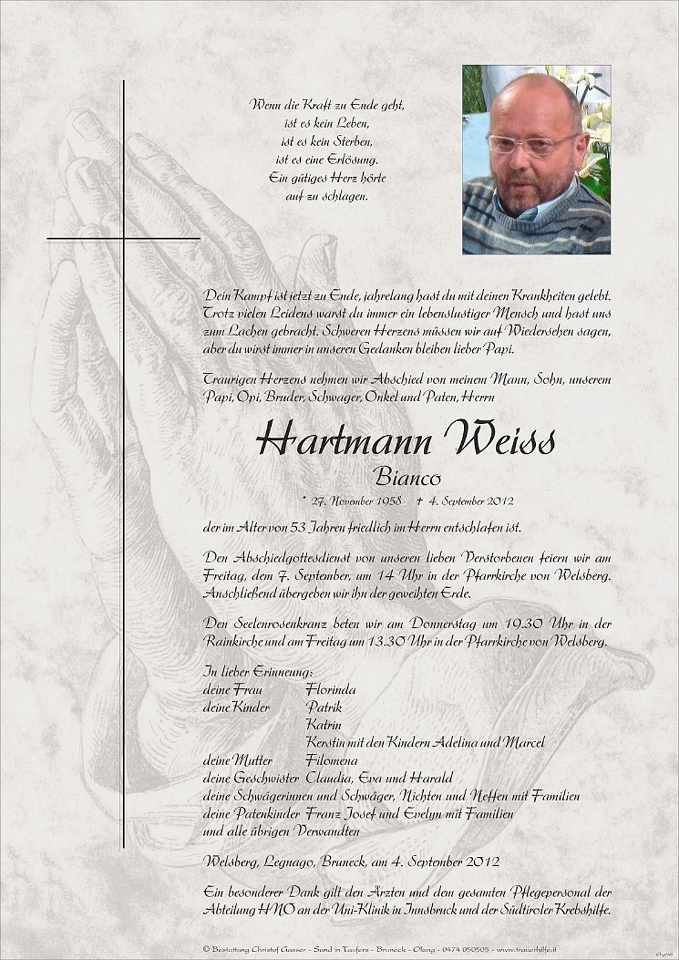 Den Abschiedgottesdienst von unseren lieben Verstorbenen feiern wir am Freitag, dem 7. September, um 14 Uhr in der Pfarrkirche von Welsberg. Anschließend übergeben wir ihn der geweihten Erde.